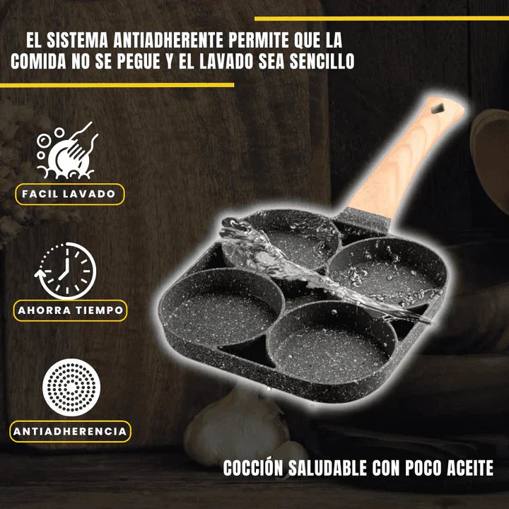 Cocinar con varios sartenes no solo toma más tiempo, sino que también significa más desorden y esfuerzo al limpiar. La Sartén Antiadherente de 4 Puestos te ayuda a cocinar de manera eficiente, sin ensuciar de más y sin gastar tiempo extra en fregar ollas y sartenes.